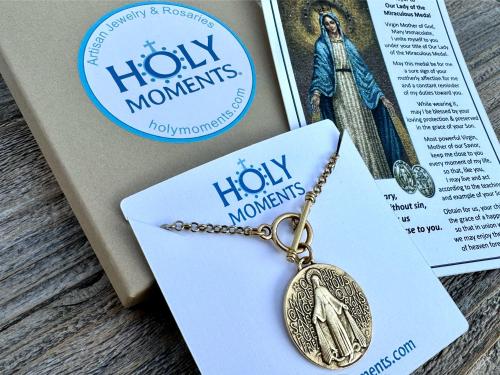 Antiqued Gold Large Miraculous Medal Front Toggle Clasp Necklace, Antique Reproduction Pendant, Signed by Balme, Medallion from France MM1