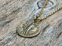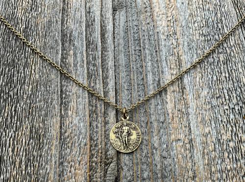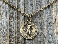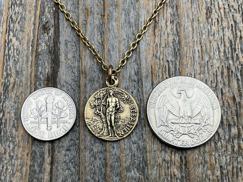 Antiqued Gold Saint Sebastian Medal Necklace, Patron Saint Athletes Soldiers, Antique Replica of Rare French St Sebastien Medallion Pendant