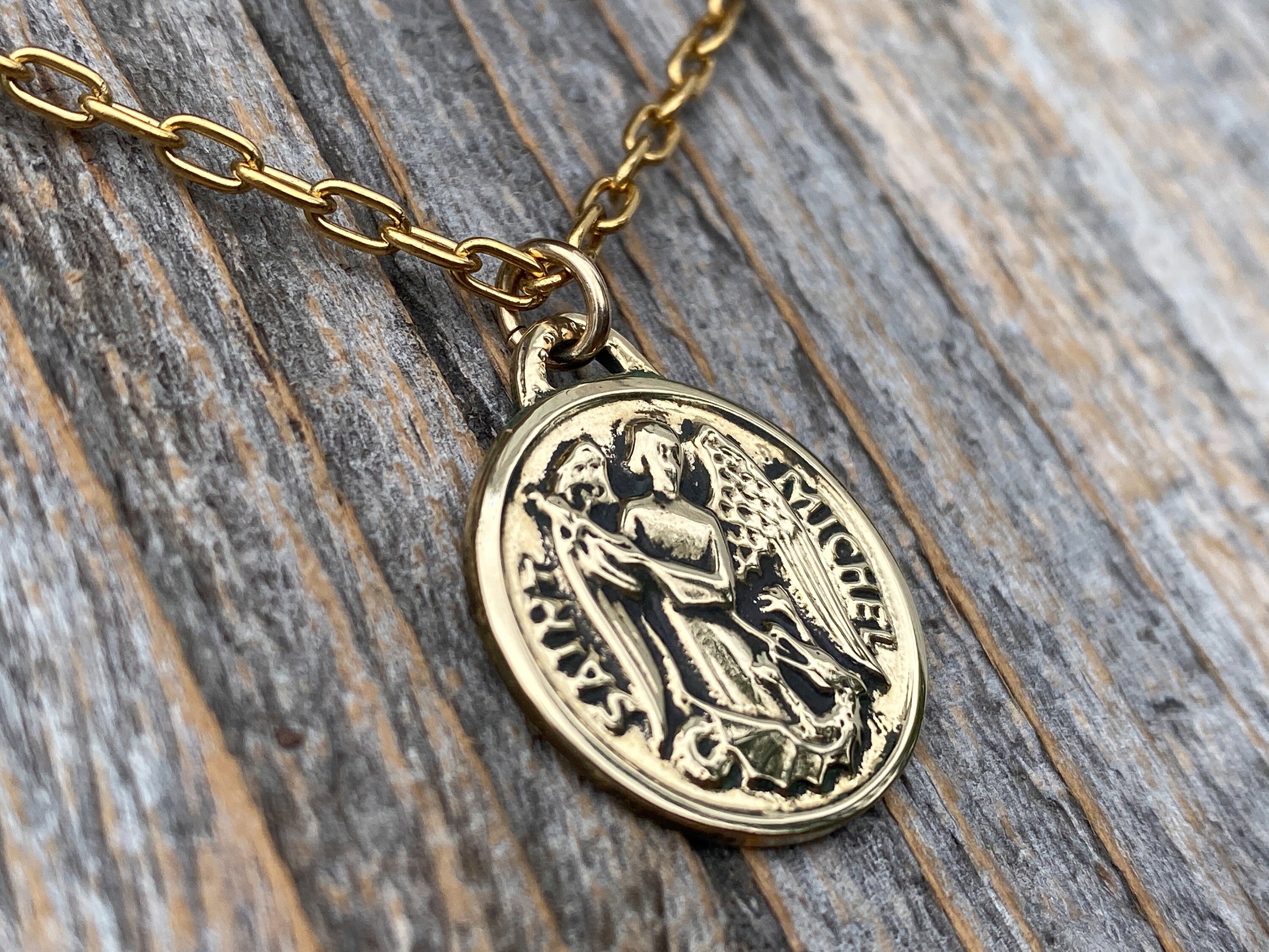 Antiqued Shiny Gold St Michael Medallion Necklace, Antique Replica French Saint Michael the Archangel, Saint Michel from France, By PCH