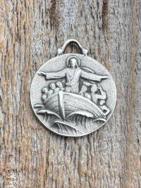 This is a rare and gorgeous antiqued solid .925 sterling silver pendant with a raised image of Jesus standing in a boat calming the storm. This image is symbolic of Jesus calming all of the storms of life, not only the ones in nature. Jesus rests in your soul and He is always there for you to turn to Him and rest in His presence and embrace. Jesus has the power to soothe the pains, hurts, and frustrations of life, if you turn to Him.