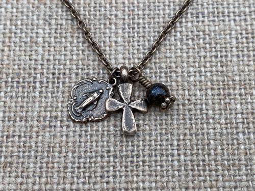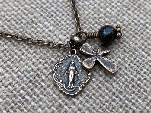 Bronze Miraculous Medal and Cross Charm Cluster Necklace, Antique Replica, Bronzite Gemstone, Dangling Charms Necklace, Boho Catholic MM3