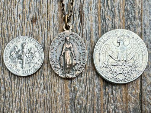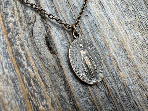 Bronze Oval French Miraculous Medal Pendant, Antique Replica of Rare Adolph Penin Signed Miraculous Medallion from France, Antiqued