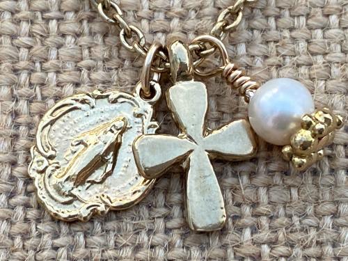 Gold Miraculous Medal Charm Cluster Pendant Necklace, Antique Replica, Dangling Cross, White Freshwater Pearl, Boho Miraculous Necklace MM3