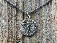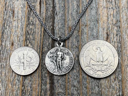 Saint Sebastian Sterling Silver Medal Necklace, Antique Replica, Patron Saint of Athletes & Soldiers Pendant, French St Sebastien Medallion